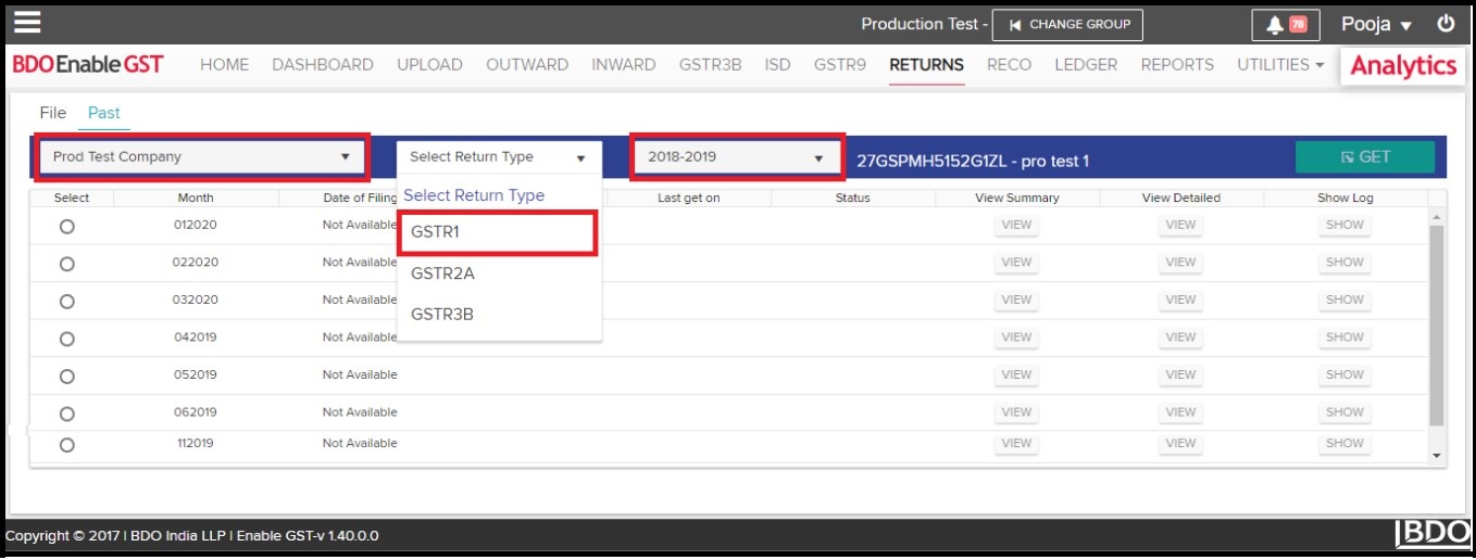 - Select Trade Name, select financial period and then select “GSTR1” return type. All return periods for the selected financial year will be populated.