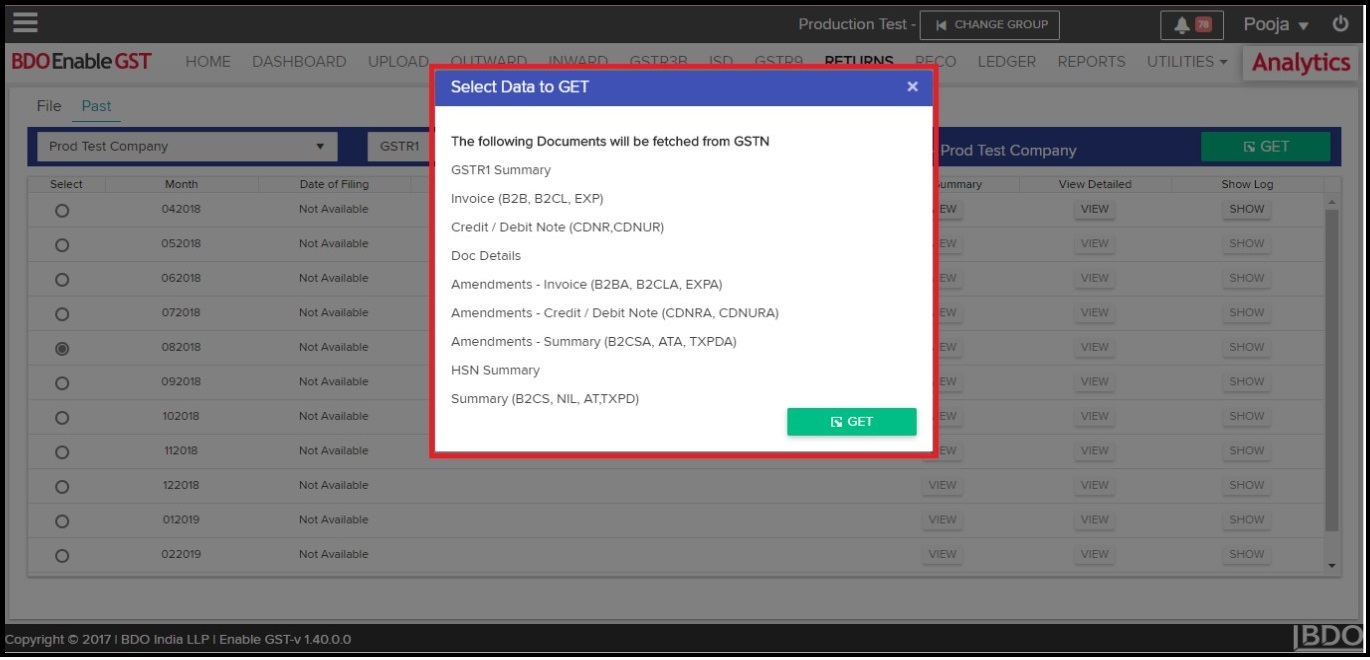 - Select one return period and click on “GET”. It will prompt you to “Select Data To GET”. Kindly select the check boxes for the data that you wish to get from GSTN.