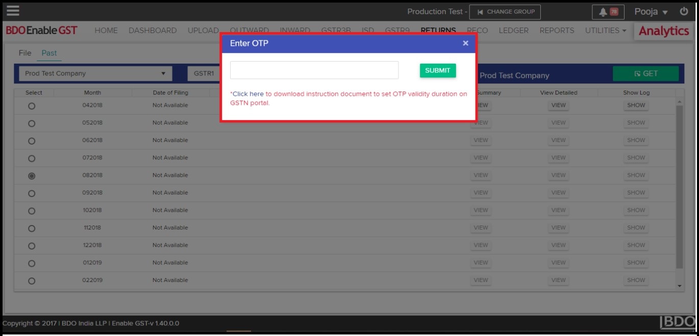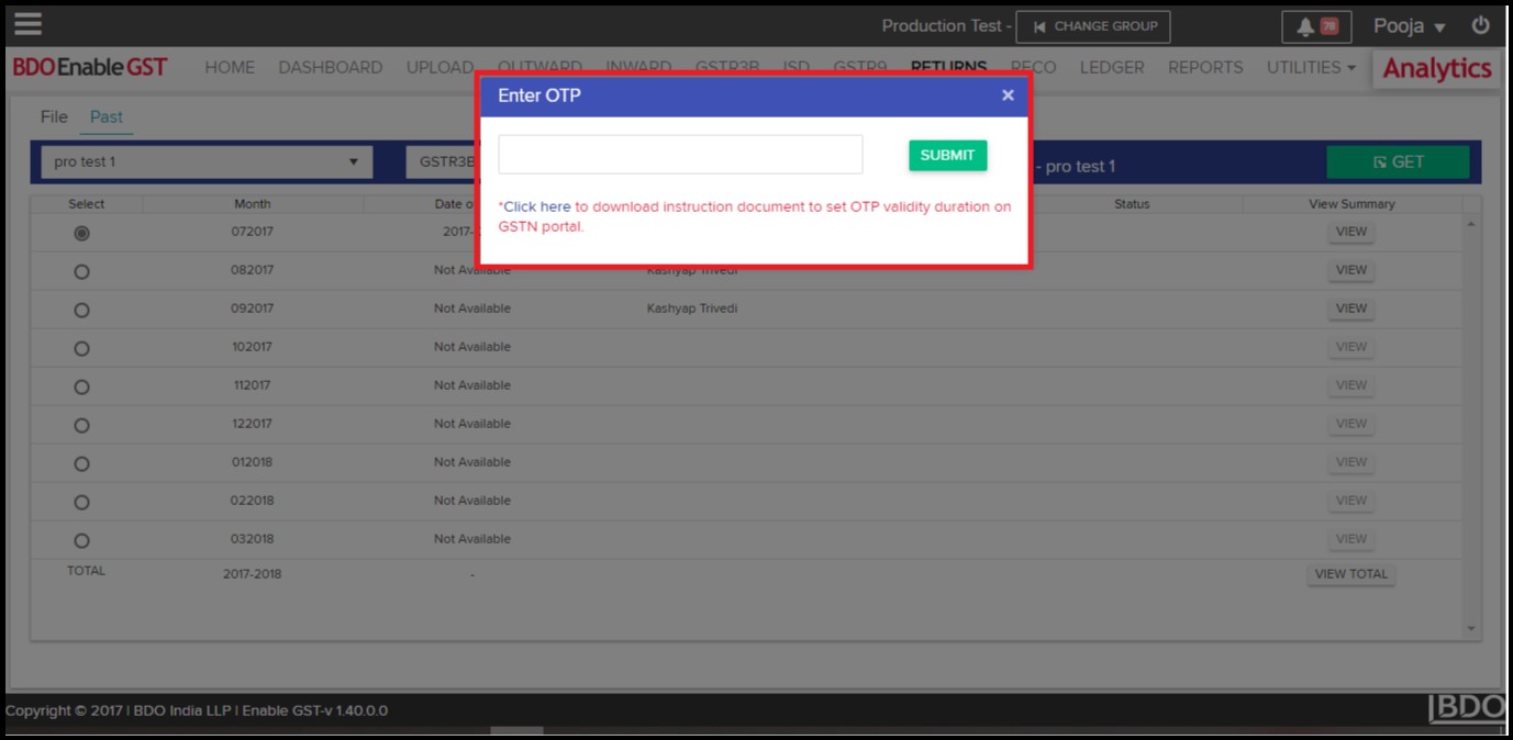 - Once you click on “GET”, system shall ask for OTP to proceed further. Kindly make a note, the OTP shall be delivered to the email id & mobile no. which has been registered with GSTN portal.
