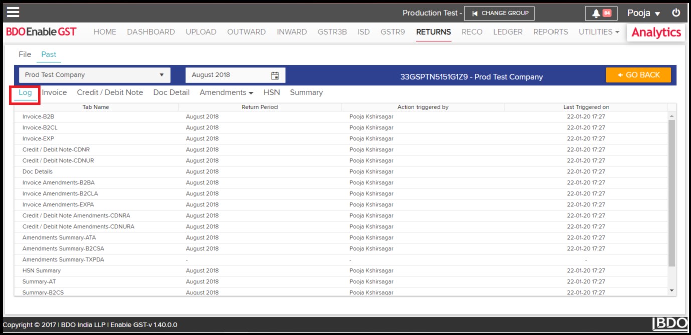 - Once you click on ‘View’ following page will displayed. “Log” tab will show what activities have been performed i.e. Invoice, Credit / Debit Note, Doc Details & Amendments along with the return period & the user who have performed these activities.