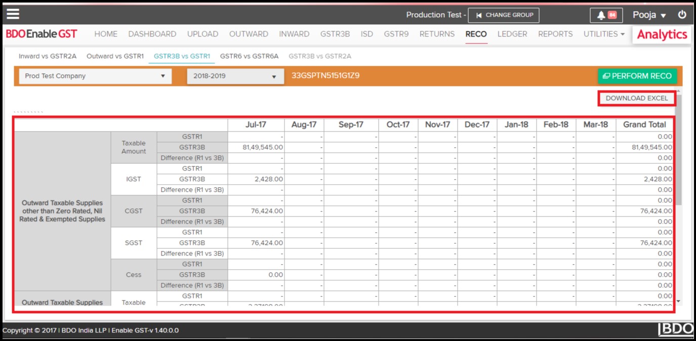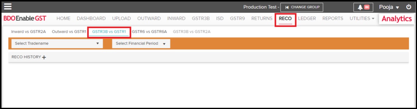 - Click on “Reco” Tab, then select GSTR3B vs GSTR1.