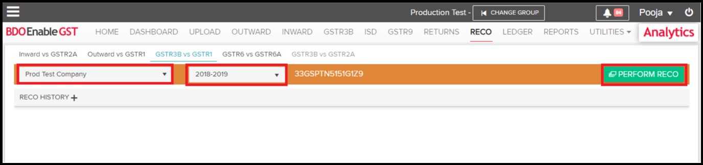 - Select the Trade Name i.e. GSTIN & Financial Period & click on “Perform Reco” button.