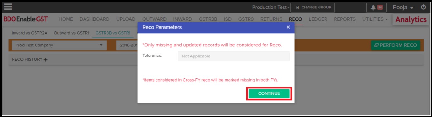 - When you click on “Perform Reco” it shall ask user for Tolerance, but it is not applicable. Click on “Continue”.