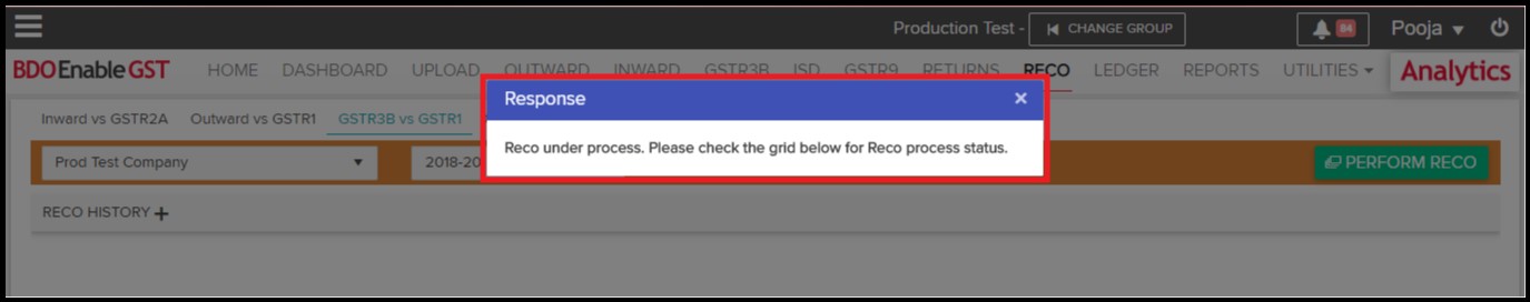 - A pop-up is displayed stating “Reco under process. Please check the grid below for Reco process.