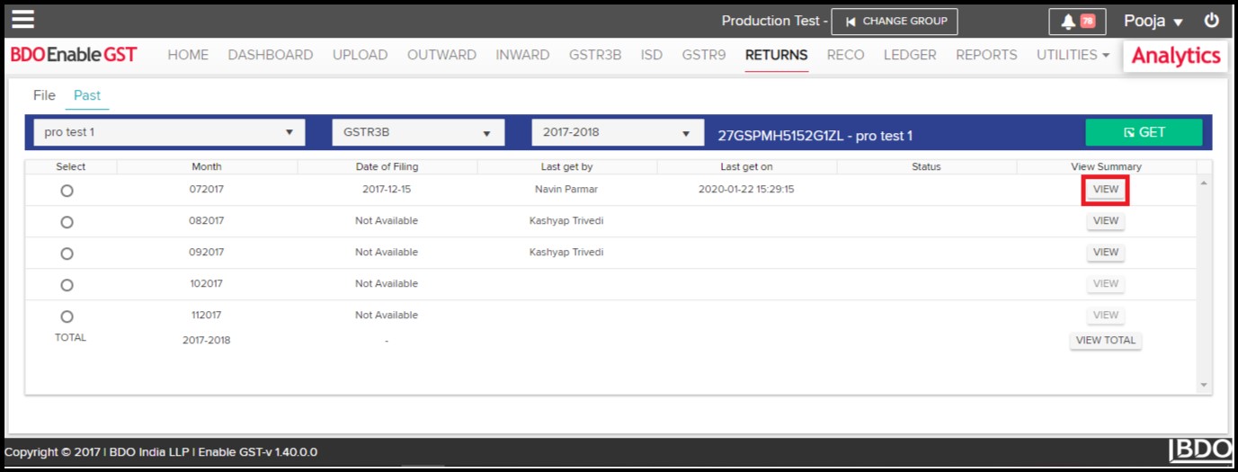 - View Summary Data: Click on “View” under view summary section to view GSTR3B return data for the selected return period.