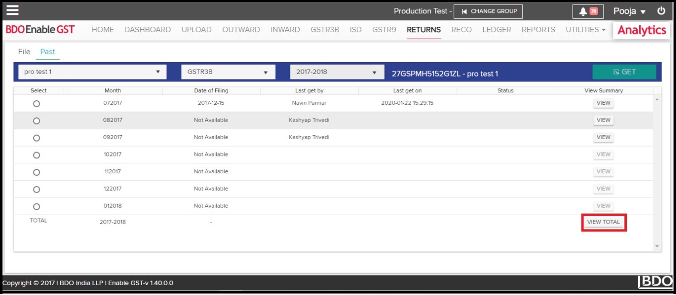 User can download return summary details by clicking on “Export As PDF” or “Export As Excel”. & also user can download return financial year details by clicking on “View Total”.